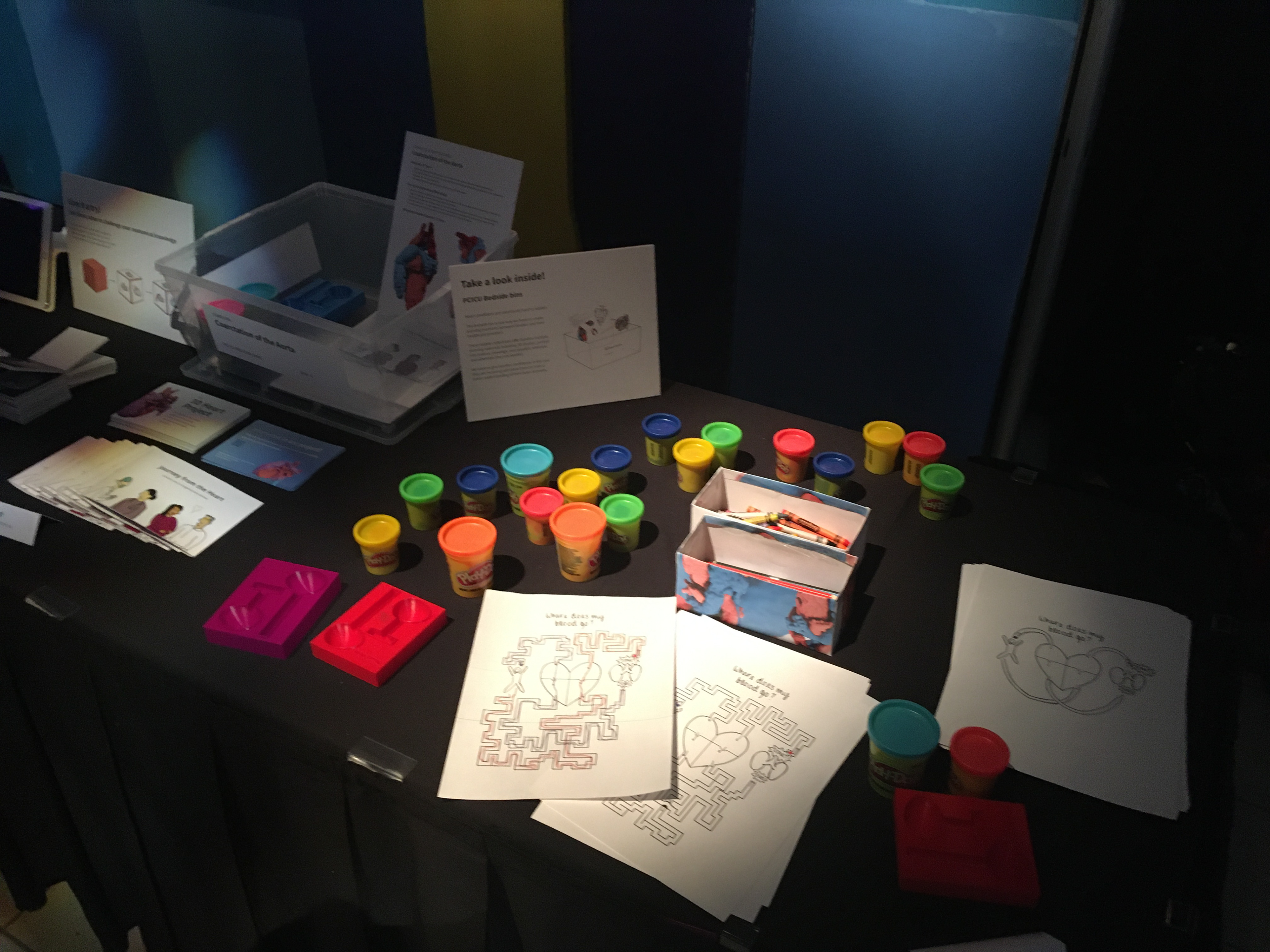 Dr Charles Larson with our displays featuring 3D printing, Heart-Doh, spatial cubes, and storybooks.